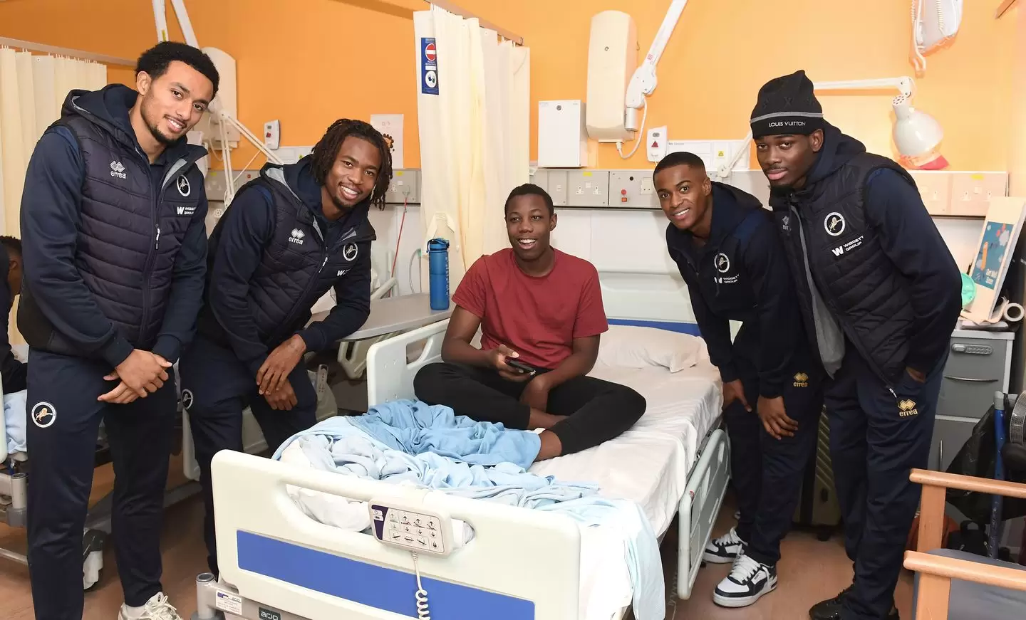 艾丹莫·埃马库、费米·阿齐兹、德里克·马祖-萨科、卡斯珀·德·诺雷、扎克·斯特奇和韦斯·哈丁共同向医院的病人和工作人员分发了礼物,随着圣诞日的临近,他们的到来让每个人的脸上都洋溢着笑容。